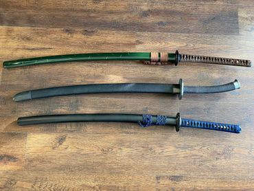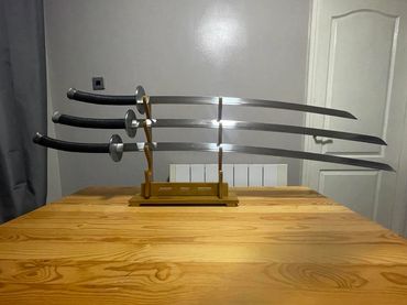 I'm fortunate to own the whole set of three swords. They are all very good cutting swords with beautiful shapes. I will try to explain the difference between them.