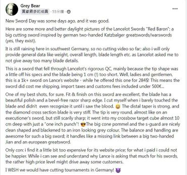 Lancelot's note: Tung has not cut with the swords yet, so he does not realize Classic's extreme cutting power over the other two, not yet. There's a photo that is comparing Longship Armoury Giant Silvia and Supreme Cutter Ultra, with the former costing over 3.27 times more. The Ultra is a lot more agile and faster than the GS, and cuts even better.